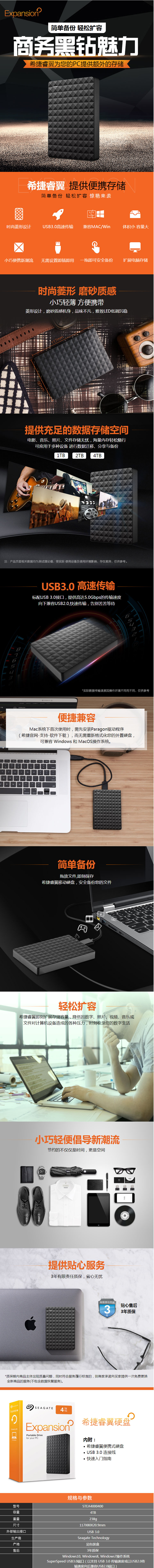 希捷(seagate) 4TB USB3.0 移动硬盘 Expansion 睿翼 2.5英寸 黑钻版 商务时尚 轻薄便携 高速传输 商务黑 (4TB)